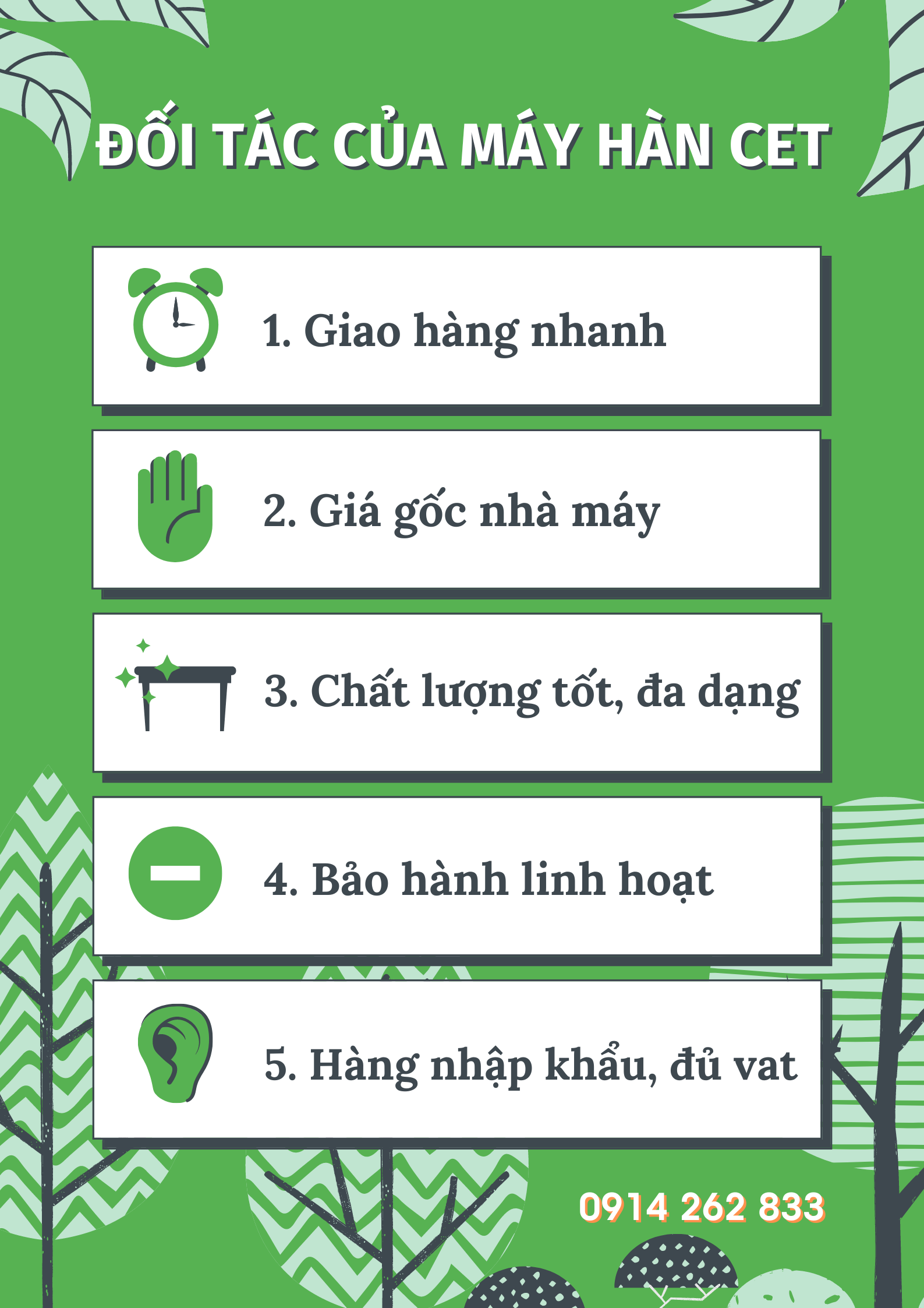 CET là thương hiệu máy hàn điện tử chất lượng cao, nổi bật với các dòng sản phẩm hiện đại, hiệu suất ổn định, đáp ứng nhu cầu hàn ghép vật liệu đa dạng trong các ngành công nghiệp. Sản phẩm máy hàn CET không chỉ đạt chuẩn chất lượng, mà còn được người tiêu dùng đánh giá cao nhờ vào độ bền bỉ và tính an toàn khi sử dụng. Việc trở thành đối tác phân phối máy hàn CET tại Bắc Giang mang lại nhiều lợi thế nổi bật:
