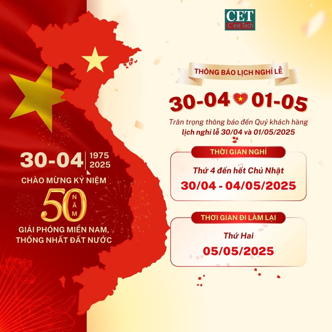 Trân trọng thông báo đến Quý khách hàng lịch nghỉ lễ 30/04 và 01/05/2025