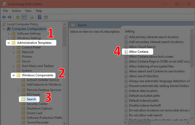 - Bước 2: Chọn Administrative Templates > Chọn Windows Components > Chọn Search > Chọn Allow Cortana.