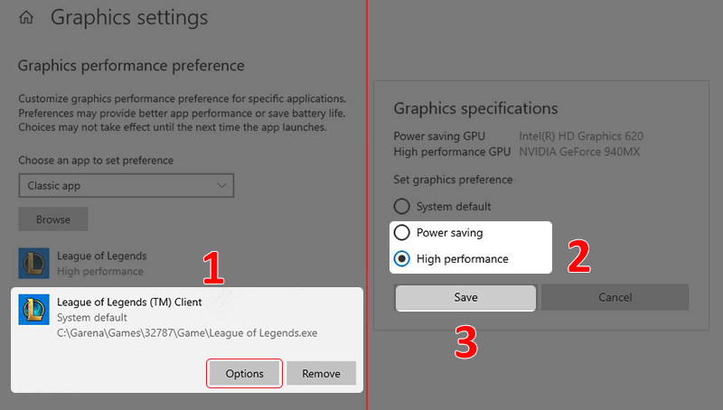 - Bước 2: Mở ứng dụng bạn muốn điều chỉnh hiệu suất đồ họa, chọn Options > Chọn "High performance" để sử dụng ứng dụng với hiệu suất đồ họa cao hoặc "Power saving" để tiết kiệm pin > Nhấn Save.