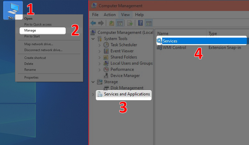 - Bước 1: Nhấn chuột phải vào biểu tượng This PC > Chọn Manage > Chọn Services and Applications > Chọn Services.