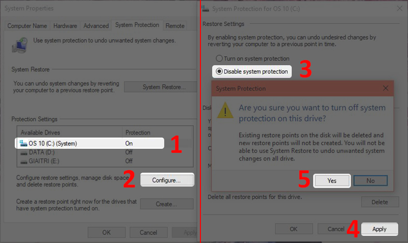 - Bước 2: Chọn ổ đĩa muốn tắt System Restore > Nhấn Configure... > Chọn Disable system protection > Chọn Apply > Chọn Yes.