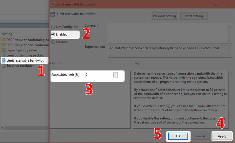 - Bước 3: Chọn Limit reservavle bandwidth > Tích chọn Enabled > Ở ô Bandwidth limit (%), nhập vào "0" > Chọn Apply > Nhấn OK.