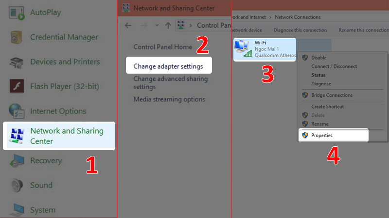 - Bước 1: Mở Control Panel, chọn Network and Sharing Center > Chọn Change adapter settings > Nhấn chuột phải vào biểu tượng Ethernet hoặc Wifi mà bạn đang sử dụng > Chọn Properties.