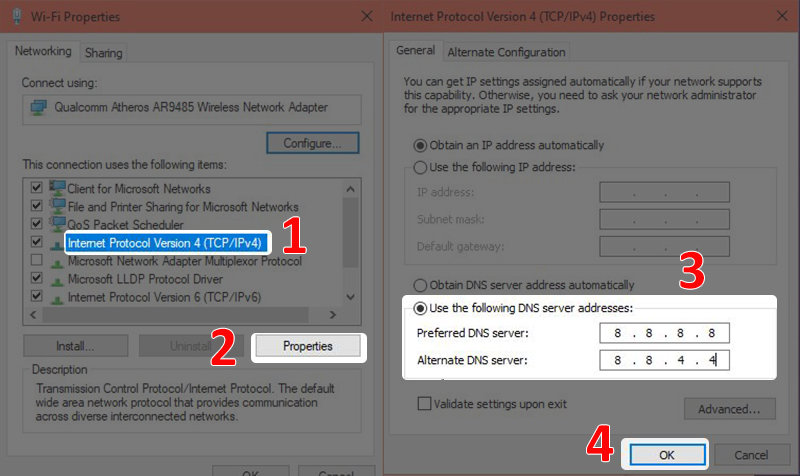 - Bước 2: Chọn Internet Protocol Version 4 (TCP/IPv4) > Chọn Properties > Nhập vào địa chỉ DNS server như hình bên dưới (Đây là địa chỉ của Google Public DNS Server, bạn có thể tham khảo và sử dụng các địa chỉ DNS server khác) > Nhấn OK.