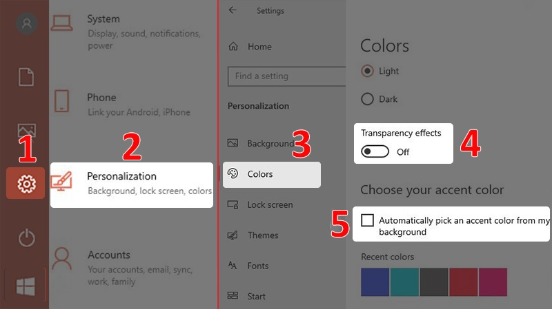 Cách thực hiện như sau: Mở Cài đặt > Chọn Personalization > Chọn Colors > Bấm vào biểu tượng On/Off để tắt hiệu ứng trong suốt tại dòng Transparency effects > Bỏ tích tại dòng Automatically pick an accent color from my background để vô hiệu hóa màu tự động.