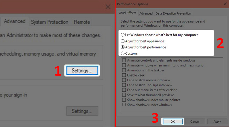 - Bước 2: Tại mục Advanced, chọn Settings > Ở thẻ Visual Effects, chọn Adjust for best performance (Bạn có thể chọn Custom để bật/tắt hiệu ứng hình ảnh của các thành phần theo ý thích).