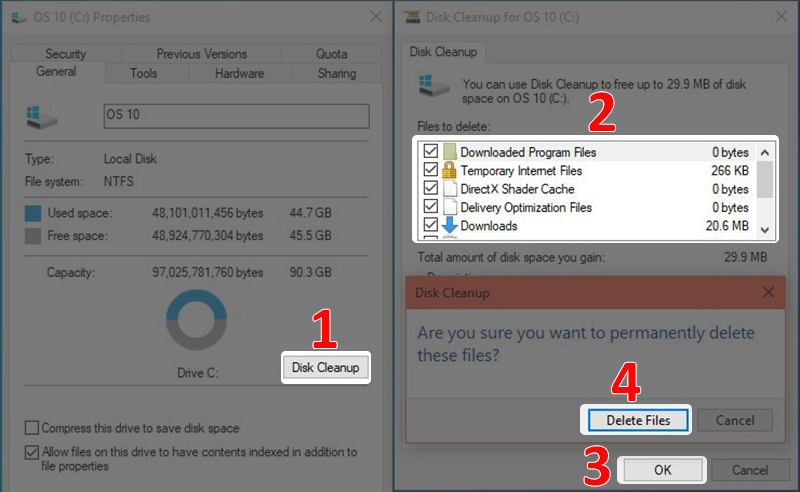 • Sử dụng tính năng Disk Cleanup: Nhấn chuột phải vào ổ đĩa mà bạn muốn dọn rác (ví dụ ổ C), chọn Properties > Chọn Disk Cleanup > Tích chọn các file bạn muốn xóa > Chọn OK > Chọn Delete Files để hoàn tất.