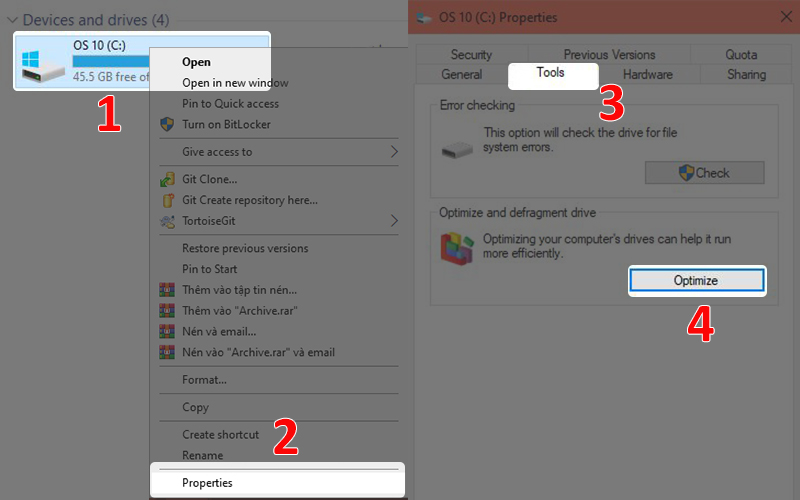 - Bước 1: Nhấn chuột phải vào ổ đĩa mà bạn muốn chống phân mảnh > Chọn Properties > Chọn thẻ Tools > Chọn Optimize.