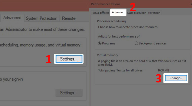 - Bước 2: Tại mục Advanced, chọn Settings > Mở sang thẻ Advanced, nhấn Change...