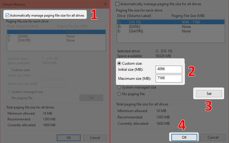 - Bước 3: Bỏ đánh dấu ở dòng Automatically manage paging file size for all drives > Nhập dung lượng muốn set RAM ảo tại mục Custom size, ở đây mình đặt là 4096 MB (4 GB) và tối đa là 7168 MB (7 GB) > Chọn Set > Chọn OK.